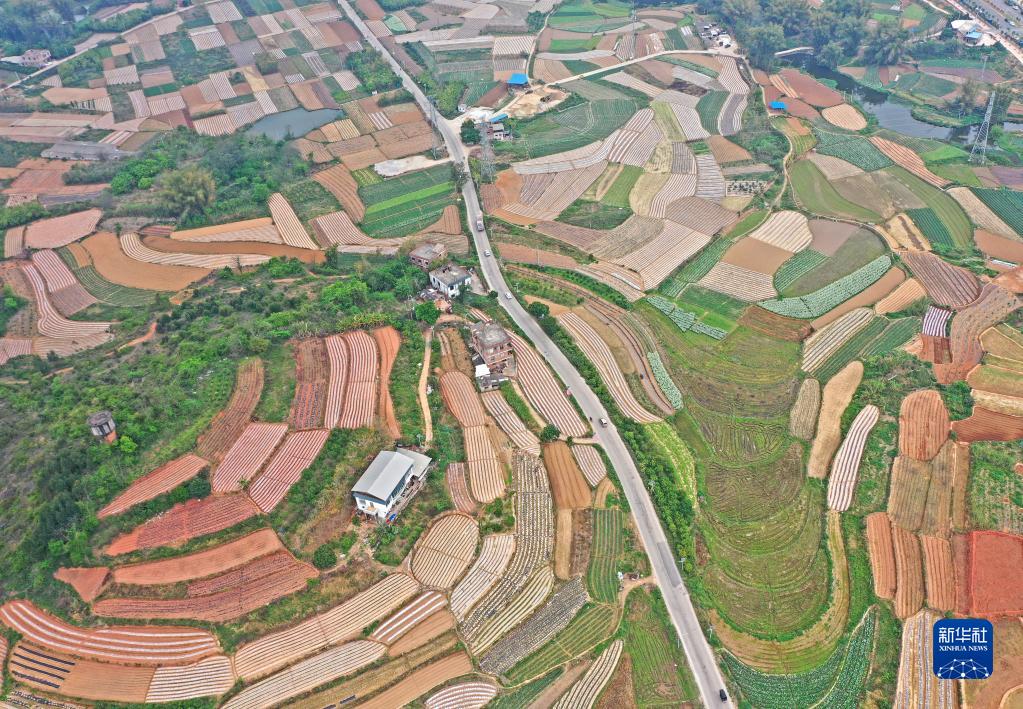 春回大地,廣西南寧市邕寧區(qū)蒲廟鎮(zhèn)縱橫交錯(cuò)的田地色彩斑斕,宛如色彩豐富的調(diào)色板(3月13日攝,無人機(jī)照片)。