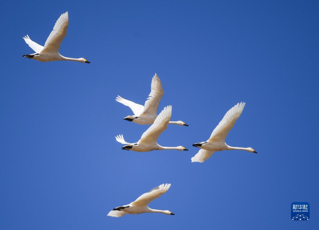 3月30日,天鵝在呼和浩特市土默川平原上飛翔。