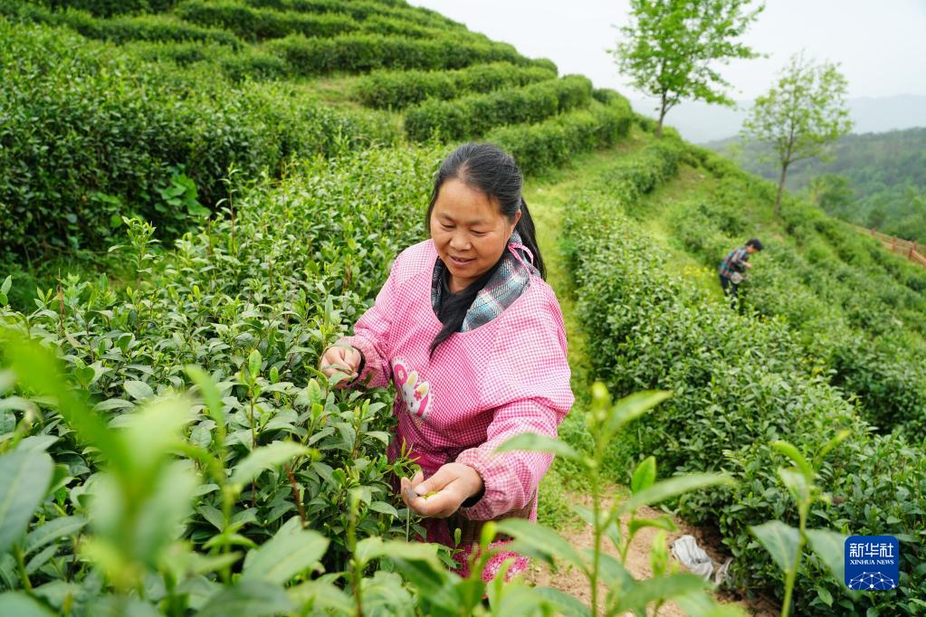 4月12日,茶農(nóng)在安康市平利縣老縣鎮(zhèn)蔣家坪村茶山上采茶。