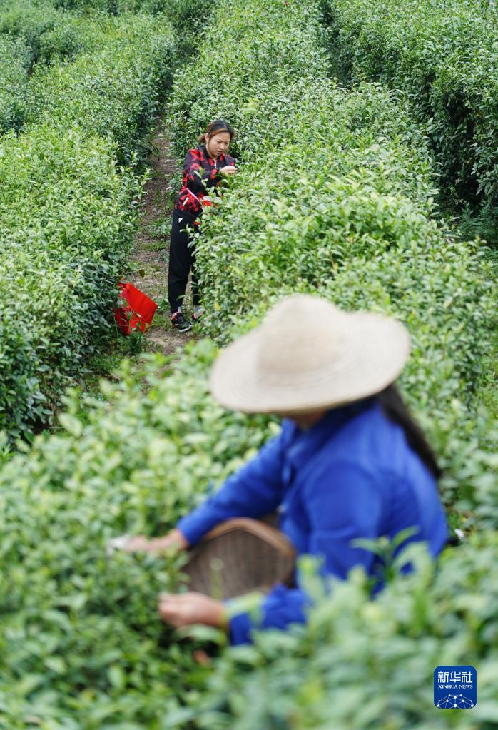 4月12日,茶農(nóng)在安康市平利縣老縣鎮(zhèn)蔣家坪村茶山上采茶。
