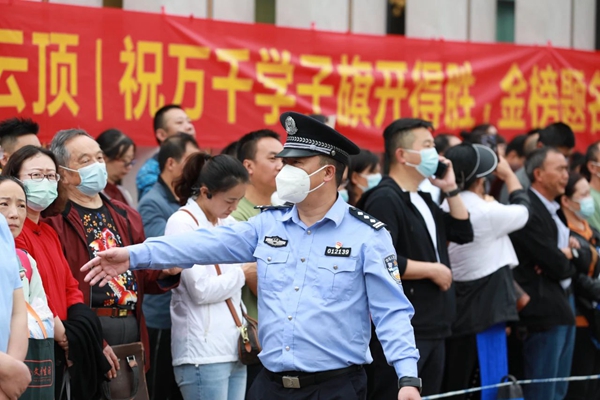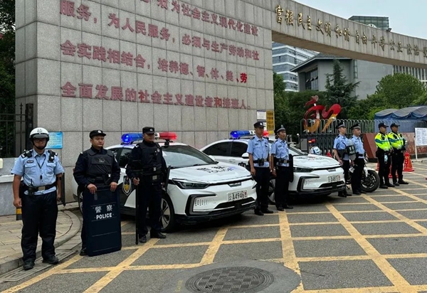 高考期間,為確保考試安全、有序、順利進行,考點安保執(zhí)勤警力提前到崗到位,對考點及周圍開展定點執(zhí)勤和武裝巡邏,快速處置各類緊急突發(fā)情況,確??紙鲋苓呏刃蚓?。