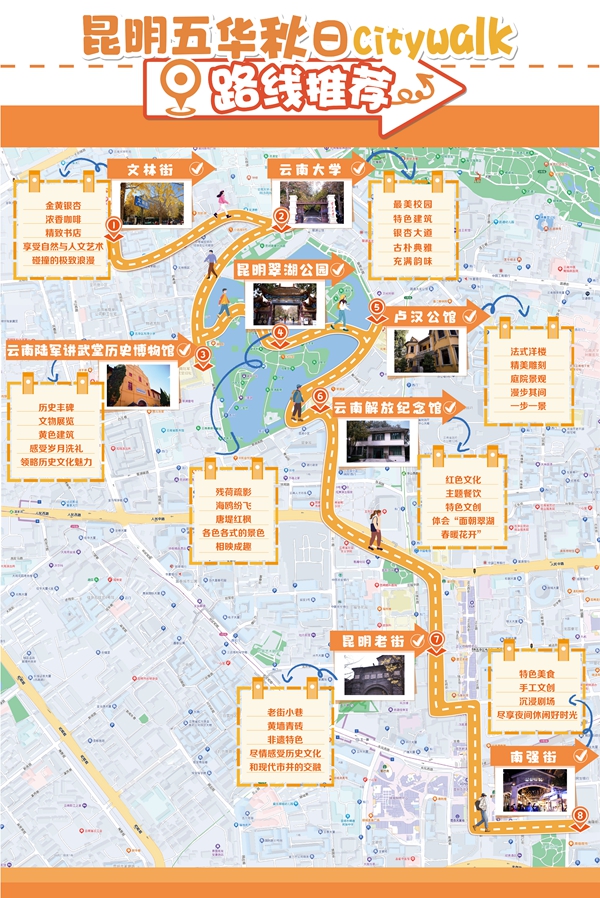 沿著城市的大街小巷,品嘗各種美食,欣賞各色風(fēng)景,將屬于昆明五華的溫暖留在心間,快和小伙伴到昆明五華來(lái)一場(chǎng)說(shuō)走就走的Citywalk吧!(張培妮 五華區(qū)融媒體中心供稿)