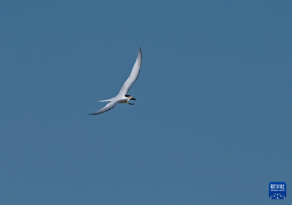 一只中華鳳頭燕鷗叼著剛捕到的小魚在閩江河口濕地上空飛翔(5月14日攝)。