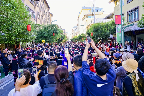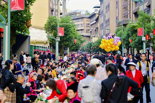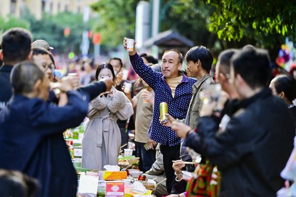 被譽(yù)為哈尼族“春節(jié)”的“十月年”,是慶祝豐收、祈福納祥的重大節(jié)日。當(dāng)日16時(shí)30分,隨著哈尼族“龍頭”一聲祈福令下,綿延近5公里的3265桌長(zhǎng)街古宴正式開(kāi)席,萬(wàn)人同席、舉杯共歡的壯觀場(chǎng)景,再現(xiàn)了2004年獲評(píng)“天下最長(zhǎng)宴席”的基尼斯風(fēng)采。席間,身著民族服飾的哈尼姑娘們,端著醇香的悶鍋酒穿梭席間,主動(dòng)為游客添酒布菜,來(lái)自五湖四海的游客與本地各族群眾圍坐一席,或舉杯共飲,或交流合影,陌生的距離在共品一菜、共飲一杯中悄然消融,大家互道祝福,桌連桌、人挨人的熱鬧場(chǎng)景中,“各美其美、美美與共”的理念悄然傳遞,歡聲笑語(yǔ)伴隨著铓鼓的節(jié)奏,在街道上空回蕩、匯聚,生動(dòng)詮釋著“中華民族一家親”的深厚情誼。