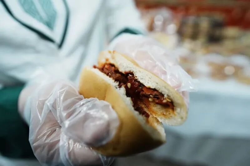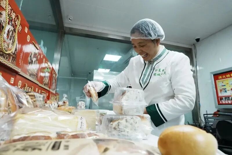 操作間里,新品——“辣皮子面包”的面團正是使用的儲綠集團提供的高筋面包粉制成?!八潜镜氐膬?yōu)質面粉,是我們進行風味創(chuàng)新的最佳畫布?!睅煾狄贿吶嗝嬉贿呎f,“它吸水性強,延展性好,能很好地承載我們添加的各種本土特色食材,而不失面包應有的結構。”恰夏疆醇面包坊銷售負責人李霞拿著“辣皮子面包”笑著說。