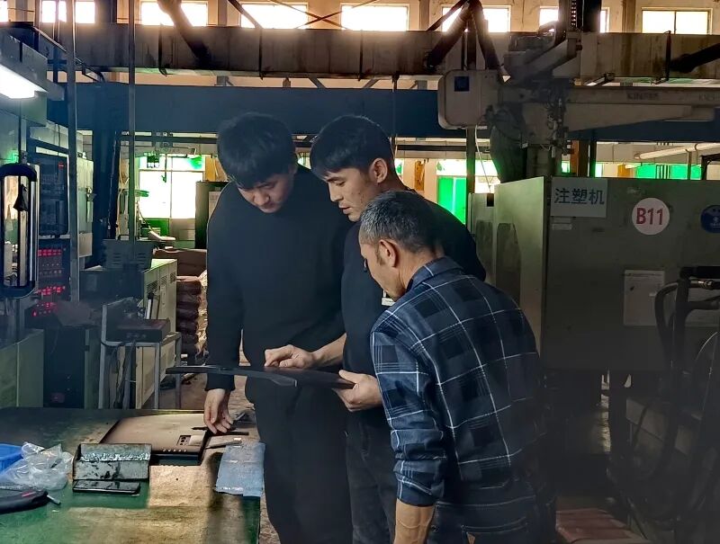 車間內(nèi)吾布力卡司木?買吐地和同事核驗(yàn)工件。