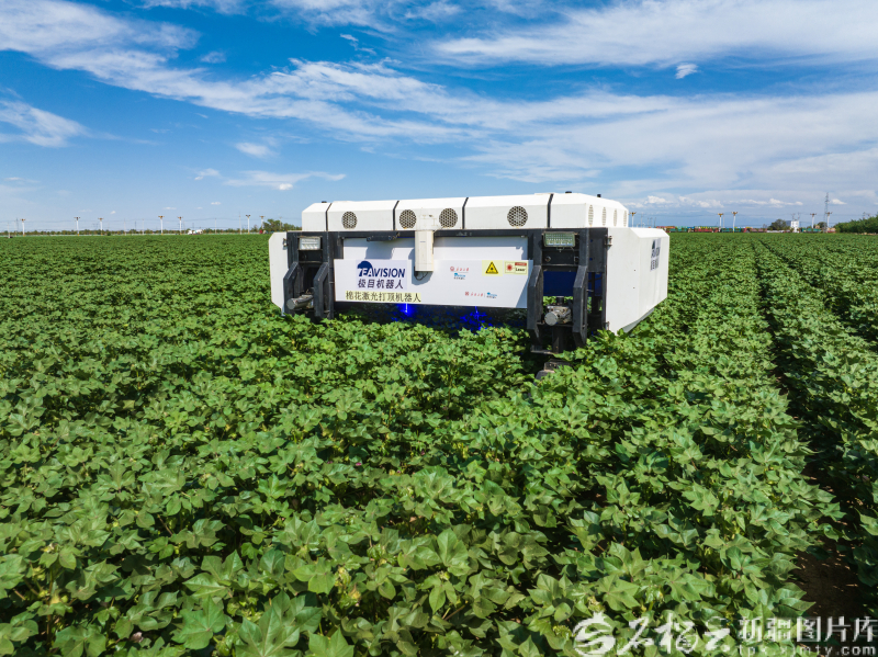 7月23日,昌吉市榆樹溝鎮(zhèn)榆樹溝村棉田里,棉花激光打頂機器人正在作業(yè),其棉花頂芽識別準確率達 98.9%。何龍攝