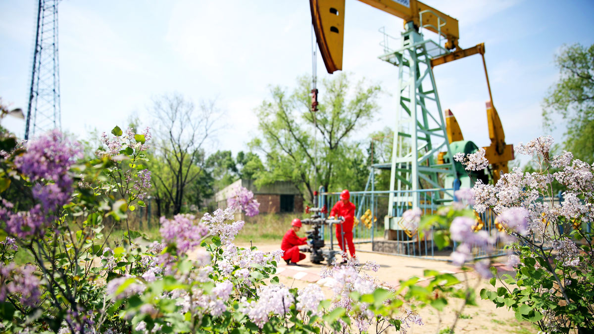 采油六廠一礦員工在鮮花簇?fù)碇袡z查采油樹(shù)連通閥
