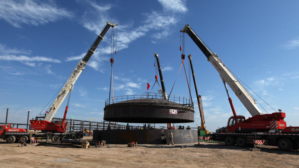大慶油田工程建設(shè)進(jìn)行伊拉克哈法亞油田CPF1項(xiàng)目3000立罐體吊裝罐體安裝