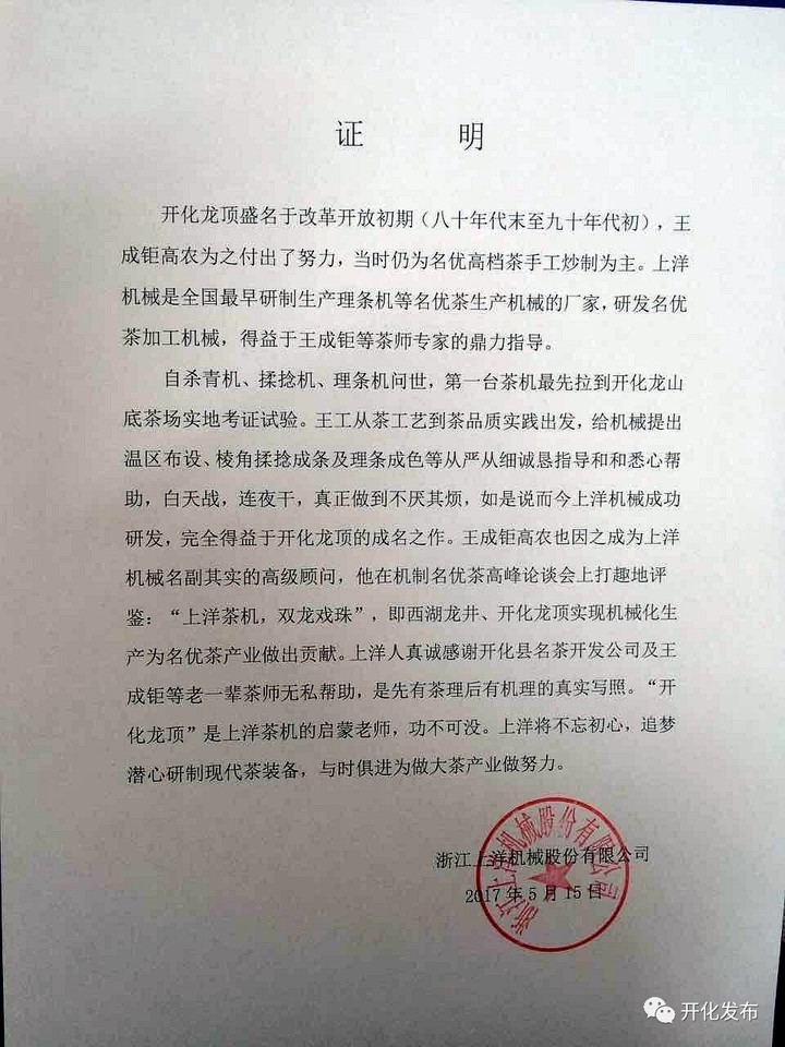 20世紀(jì)90年代初,開化縣特產(chǎn)局與浙江上洋茶機廠合作,把第一臺茶機最先拉到開化龍山底茶場實地考證試驗,以“開化龍頂”茶工藝要求為標(biāo)準(zhǔn),通過多次試驗摸索,反復(fù)實踐,分段設(shè)計,先易后難,首先在殺青、理條和烘干三道工序?qū)嵭袡C械化,而后在烘干提香工序的機械在進行試制,逐步地實現(xiàn)全程機械化。正是這套名優(yōu)高檔茶加工成套機械,通過了國家級新產(chǎn)品鑒定,被全面運用,才促進了我國芽茶生產(chǎn)向機械化、商品化方向發(fā)展。