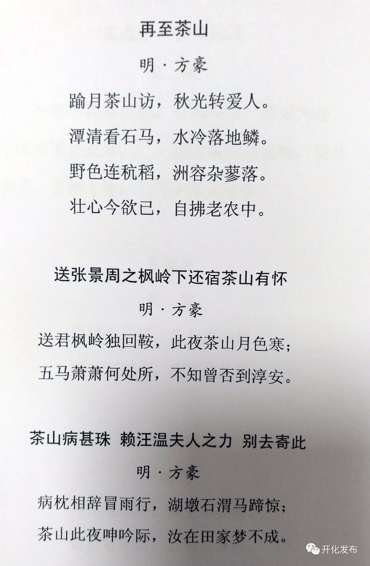 明朝正德進士福建提刑按察副史金路村人方豪,也曾在返鄉(xiāng)守孝期間寫下送友過茶山、養(yǎng)病在茶山和《再至茶山》三首詩,這些開化先賢對于茶的描寫,無不透露出開化產(chǎn)茶歷史之悠久,遠早于《開化縣志》記載的明崇禎四年。