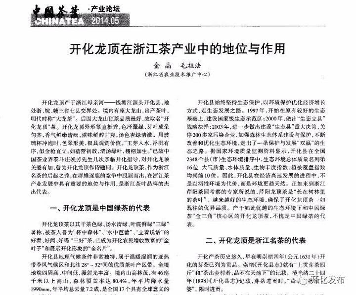 除劉高漢、張?zhí)锷J(rèn)為開化龍頂茶發(fā)展歷史悠久,開化茶葉專家們更是堅信如此。此外,他(她)們還大膽提出了“開化龍頂是芽茶始祖”的概念。