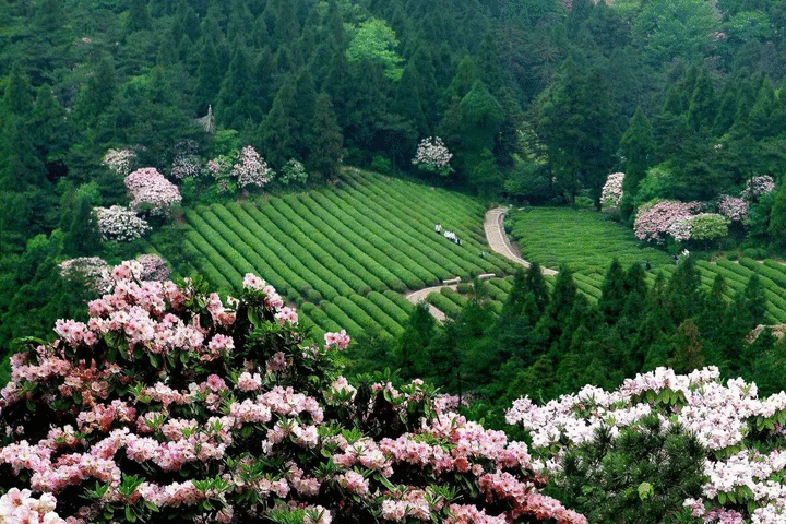 除了大片的茶園,天臺還有一絕,那就是云錦杜鵑花。特別是每年五月,云錦杜鵑盛開,漫山遍野,燦若云霞,成為一道綺麗的風(fēng)景。華頂山上的云錦杜鵑與天臺云霧茶千百年和諧共存,花茶相映,特別壯觀。