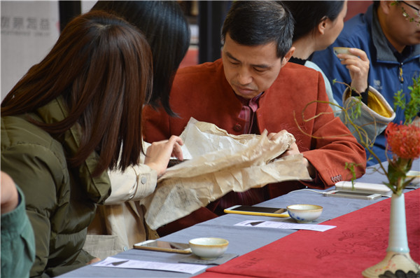 來(lái)自中山茶文化促進(jìn)會(huì)的茶友們一同品鑒了廣州市瑞豐實(shí)業(yè)發(fā)展有限公司的兩道茶:云南七子柑普餅茶和九六小黃印。第一道陳皮普洱餅茶經(jīng)普洱茶傳統(tǒng)工藝發(fā)酵,精心拼入上好陳皮絲,茶性溫潤(rùn)平穩(wěn),理氣健脾,溫胃散寒??诟邢喈?dāng)醇厚,有點(diǎn)陳皮的香氣,非常清新,在寒冷的冬天里喝到這樣的茶令人心情愉悅;第二道九六小黃印,選自1996年的生普老茶新壓而成,原料存于云南西雙版納,是2016年壓制后送往廣東倉(cāng),口感醇厚,生津持久。聆樂(lè)的舒適、飲茶的愉悅和品茶的快感立即將茶友們帶至一個(gè)精妙絕倫的茶語(yǔ)世界,感受到中華茶文化的博大精深。