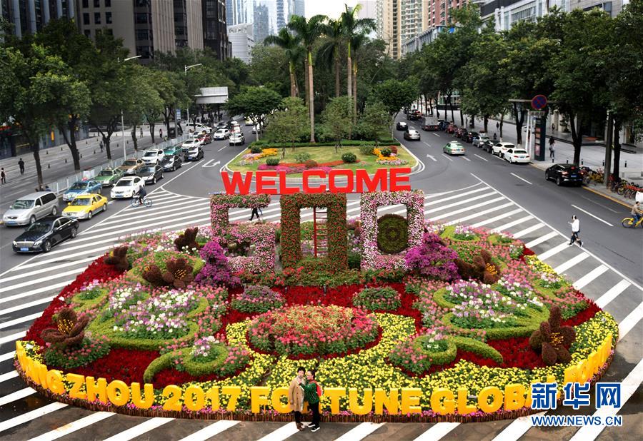 廣州街頭迎接《財富》全球論壇召開的花卉雕塑(12月4日攝)。 2017年《財富》全球論壇將于12月6日至8日在廣州舉行。屆時世界500強企業(yè)、政府和社會各界知名人士,將圍繞創(chuàng)新革命、全球化的未來、21世紀領導力以及可持續(xù)發(fā)展等話題展開討論。新華社記者盧漢欣攝