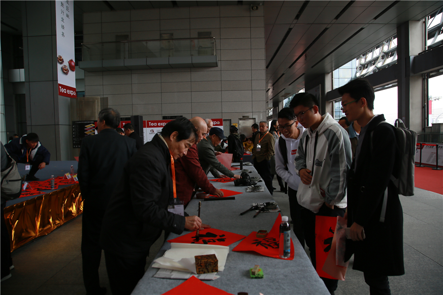 從事書法教學的職業(yè)書畫家劉潮正提起毛筆寫下“禪茶一味”,他告訴記者:“茶博會吸引著愛茶人士前來品茶,將書法帶到茶博會吸引到書法愛好者,全民互動對書法傳承會起到重要的帶動作用,也是對傳統(tǒng)文化的一種傳承。
