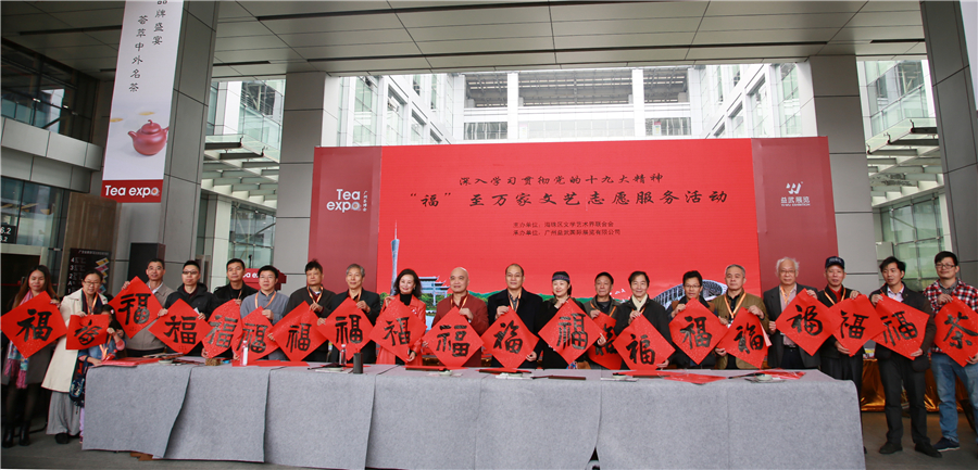 11月25日上午,海珠區(qū)文學藝術界聯(lián)合會“福至萬家”文藝志愿服務活動在廣州茶博會現(xiàn)場舉行,來自海珠區(qū)文藝界聯(lián)合會包括周樹堅、秦建中、黃澤勇等書法家現(xiàn)場題福并送福。