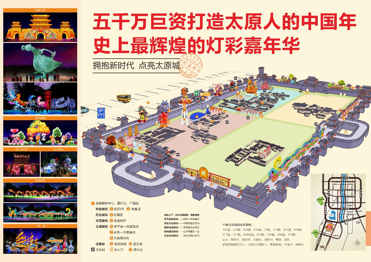 據(jù)了解,此次2018太原古縣城燈彩嘉年華共展出140余組燈,通過(guò)“年節(jié)民俗板塊——四海升平中國(guó)年”“歷史文化板塊——錦繡宏圖太原城”“國(guó)際動(dòng)漫板塊——汪汪萌寵總動(dòng)員”“時(shí)尚潮流板塊——花開(kāi)月圓又一春”“社會(huì)熱點(diǎn)板塊——邁步走進(jìn)新時(shí)代”五大板塊集中展示。其中40%的燈組為太原量身定制,鳥(niǎo)尊、趙簡(jiǎn)子車(chē)馬、盤(pán)龍柱、燃燈塔、明城門(mén)、蒙山大佛、雙塔、萬(wàn)里茶道……百萬(wàn)個(gè)流光溢彩的彩燈,簡(jiǎn)直匯聚為燈光的海洋,藝術(shù)的海洋。