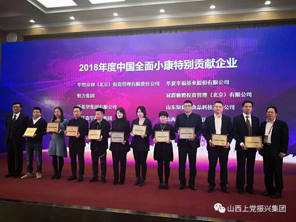 12月15日,由中國(guó)扶貧開(kāi)發(fā)協(xié)會(huì)、國(guó)家信息中心、求是《小康》雜志社聯(lián)合主辦的以“高質(zhì)量發(fā)展與決勝全面小康”為主題的2018第十三屆中國(guó)全面小康論壇在北京啟幕。會(huì)上,上黨振興集團(tuán)榮獲“2018年度中國(guó)全面小康特別貢獻(xiàn)企業(yè)”稱號(hào)。