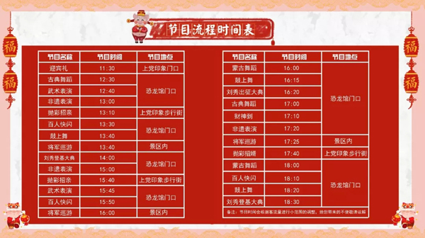 具體內(nèi)容有:百人快閃、財(cái)神到、將軍巡游、劉秀登基大典、互動(dòng)游戲、鼓上舞、武術(shù)表演、古典舞蹈、非遺表演。