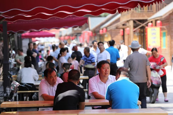 上黨印象步行街從東頭進(jìn)入,就會(huì)被一股濃郁的上黨地區(qū)風(fēng)俗民情所包圍,腳下是蜿蜒的青石板小路,身邊盡是仿古特色建筑,淺咖色的木條堆砌成墻,黛青色的屋頂,各家的招牌盡皆不同,或濃墨重彩、或清新素雅,都透出濃濃古意。