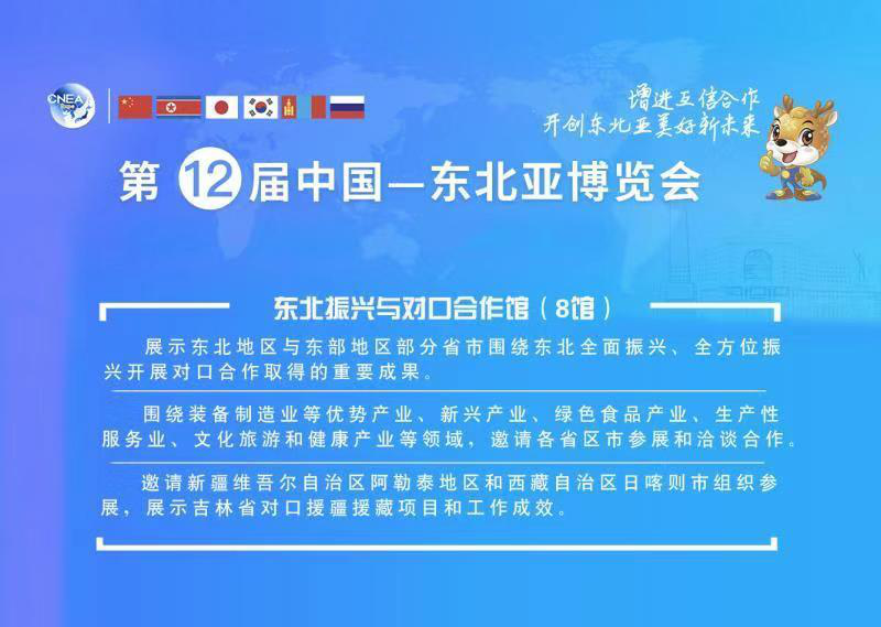 第十二屆中國—東北亞博覽會創(chuàng)新設立了東北振興與對口合作館,展覽展示面積9500平方米,設置國際展位468個,有來自浙江、天津、遼寧、江蘇、北京、沈陽、深圳、哈爾濱、大連、上海、陜西、四川、內蒙古、貴州、福建、新疆、西藏等17個省市、自治區(qū)和香港特區(qū)政府組織、企業(yè)參加對口合作成果和名優(yōu)商品展示,中糧集團、中食大地集團、上海光明集團、中鐵建中重工等大型國企集中參展。該館還設置了援疆援藏展區(qū),集中展示援疆援藏成果;長春興隆保稅區(qū)也將展現(xiàn)作為東北振興與我省對外開放新高地進行形象展示。