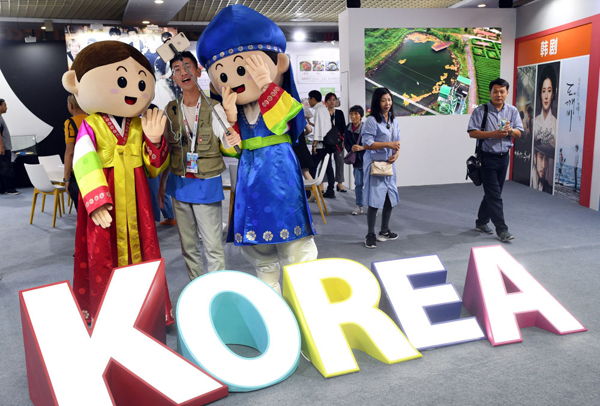 8月23日,觀眾在東北亞國家形象館韓國館內(nèi)參觀拍照。新華社記者林宏攝