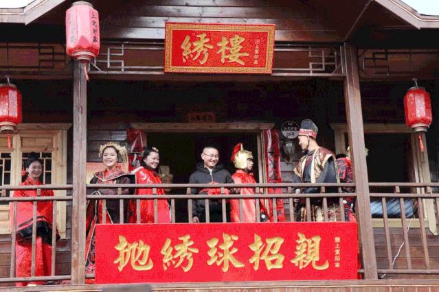 聽說王員外奉旨嫁女,特開彩樓為女兒招婿,搶到繡球的游客不僅可以跟王家三小姐拜堂成親,還可以體驗當(dāng)?shù)赜H民俗!偷偷看了兩眼,王員外家三小姐長得還是蠻好的!