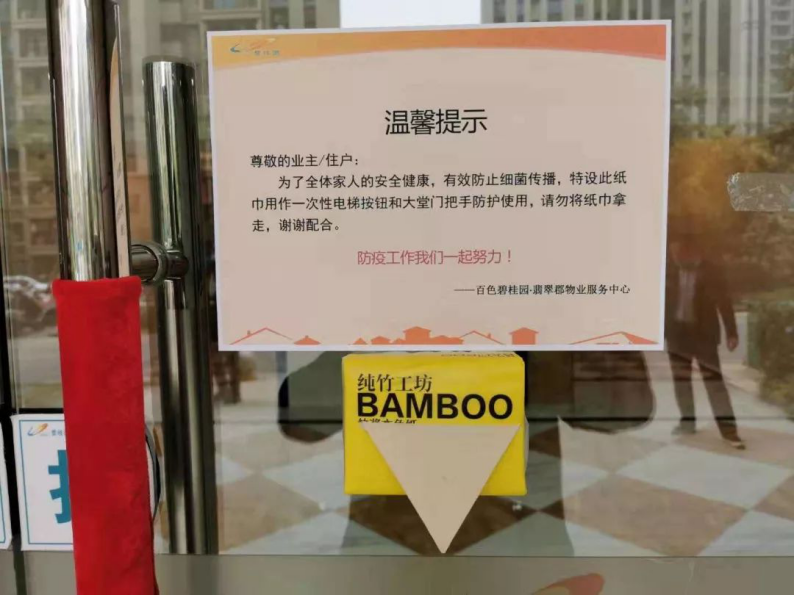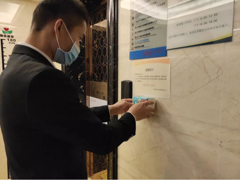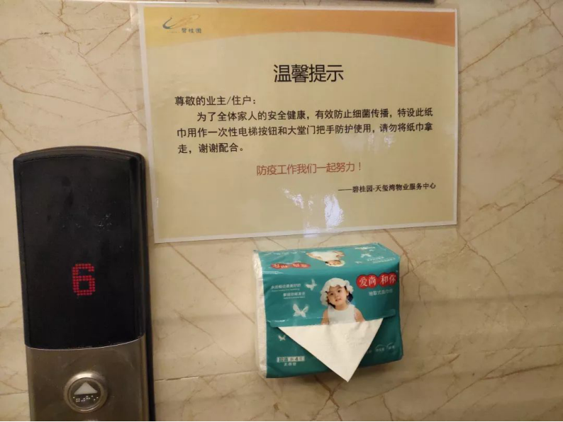 新型冠狀病毒傳播的途徑,是通過(guò)空氣中的飛沫進(jìn)行傳播,電梯間空氣不流通,人員密度大,是病毒傳播的高危地點(diǎn),為避免病毒交叉感染,各樓棟電梯內(nèi)和大堂門(mén)把手特設(shè)立按電梯、開(kāi)門(mén)專(zhuān)用紙巾,供大家使用,阻斷病毒傳播,為業(yè)主帶來(lái)安全感。