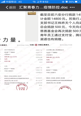 連日來,新冠肺炎疫情發(fā)展?fàn)縿?dòng)著所有六安工行人的心,該行嚴(yán)格落實(shí)疫情防控部署要求的同時(shí),廣大干部員工積極捐款,奉獻(xiàn)愛心,用實(shí)際行動(dòng)踐行初心使命。