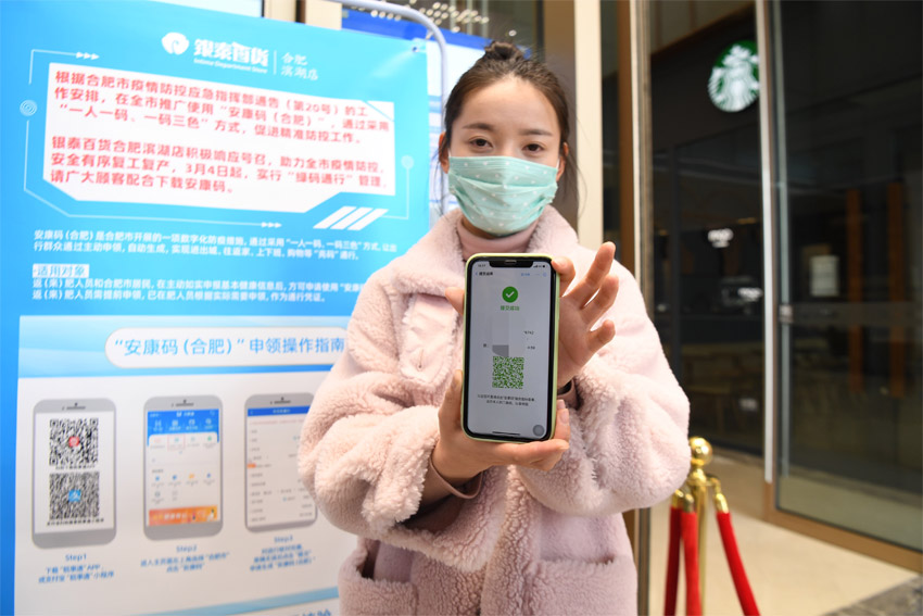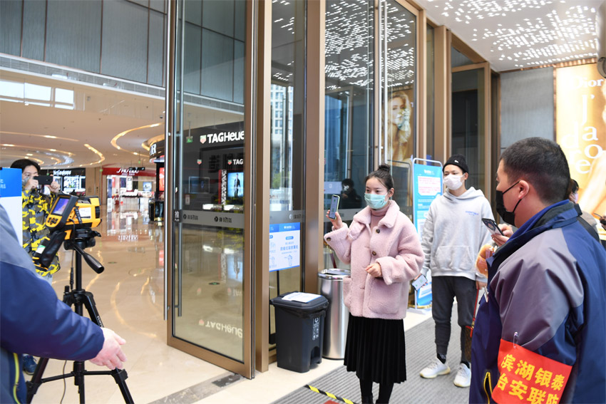 3月4日,濱湖銀泰商場率先在全市推行安康碼“綠碼通行”,即實行體溫檢測合格+“綠碼通行”疫情防控模式,進入商場的顧客必須先下載安康碼,憑出示“安康碼”綠碼和測量體溫正常后,方可有序進入商場。