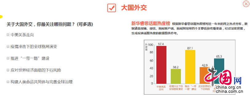 新華網(wǎng)特別推出“2020年兩會熱點(diǎn)調(diào)查”,以年增量350億條的睿思數(shù)據(jù)中心為基礎(chǔ),利用新華睿思數(shù)據(jù)云圖分析平臺獨(dú)有的網(wǎng)絡(luò)熱點(diǎn)挖掘技術(shù)及情緒感知模型,進(jìn)行多維度、多視角的深度分析,向網(wǎng)民推薦兩會熱點(diǎn)話題。記者點(diǎn)擊“大國外交”,會自動彈出相關(guān)話題框,并自動生成對應(yīng)的“新華睿思話題熱度榜”,圖片可保存。