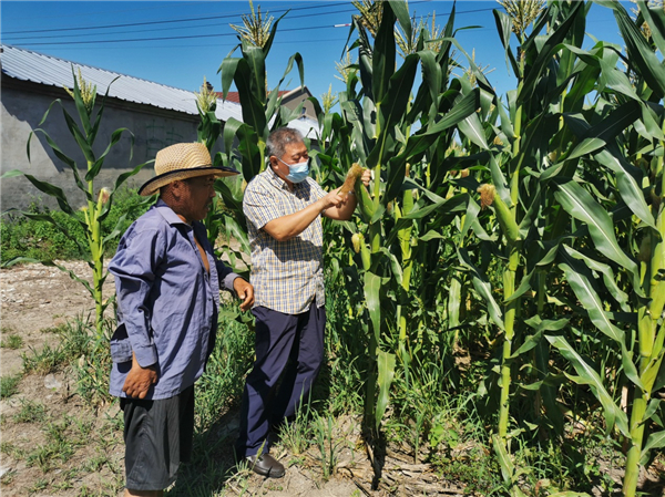 雙城建行駐雙城區(qū)永勝鎮(zhèn)永興村駐村書記崔文巍(右)與貧困戶荊國民(左)查看玉米長勢(圖/張曉鵬)