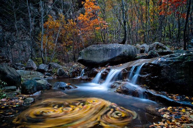 云花溪谷是八百里太行的重要組成部分,屬于典型的峽谷山地型地貌,區(qū)內(nèi)山巒起伏、峽谷縱橫,有峽谷、丘陵、梯田、平田、河灣、沙洲、瀑布、跌水、深潭、淺灘等多樣的地形。云花溪谷的地貌總體上表現(xiàn)為“南北兩高峰,九溪匯一河”?!澳媳眱筛叻濉奔茨羡纾倒遨?,海拔2281米)和北坨(百草坨),“九溪匯一河”即西部的面盆溝、羊道溝、二道莊溝三條主要溪流,在舊營村一帶匯合成為胭脂河。