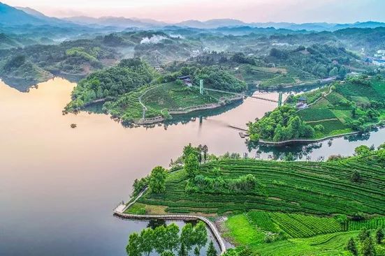 走進茶園,看山皆有情,聆水皆有意,空氣中氤氳著醉人的茶香;萬畝茶樹成團成簇,如環(huán)似陣;沿河兩側(cè)的浩瀚竹海,幽深迷離,曲徑通幽;山水茶竹輝映出一幅絕美的自然畫卷。