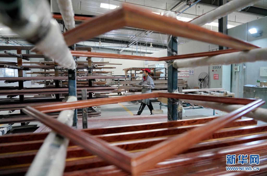 4月16日,河北省唐山市漢沽管理區(qū)宅本木業(yè)有限公司工人在車間內(nèi)搬運家具部件。