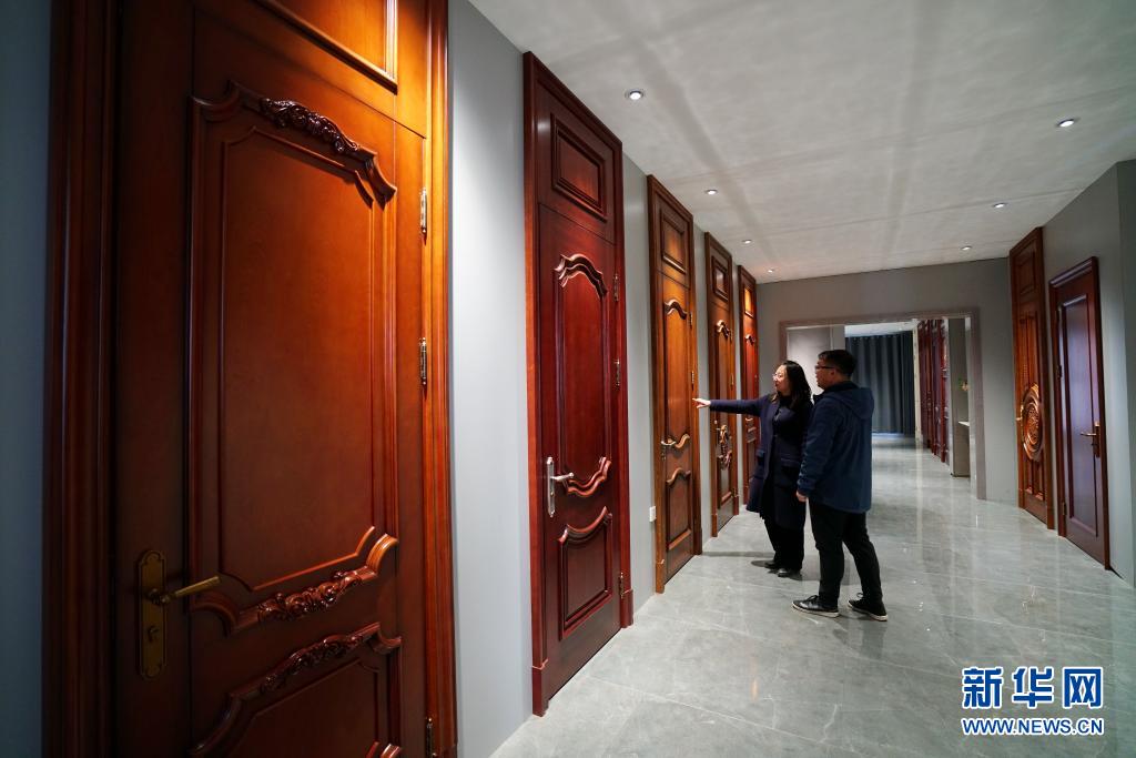 4月16日,客商在河北省唐山市漢沽管理區(qū)宅本木業(yè)有限公司展廳內(nèi)參觀木門(mén)產(chǎn)品。