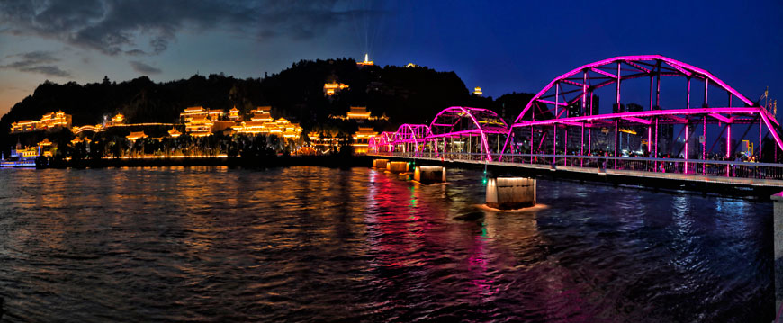 佇白塔之巔,極目四望,蘭山遙相呼應(yīng),煙雨朦朧,如夢(mèng)似幻。五泉古剎依山而就,暮鼓晨鐘,梵音妙韻,殿堂雄渾,香火久盛,眾人皆祈百福長(zhǎng)今。目光流轉(zhuǎn)間,高樓聳立,街巷阡陌,車水馬龍,人影交疊。但見(jiàn)黃河之水天上來(lái),奔流向前永不歇。河上橋梁,若繽紛彩虹,似流彩步搖。尤中山橋最為醒目,歷百年歲月洗禮,載金城滄桑巨變。驀然回首,卻見(jiàn)白塔與綠樹(shù)相映,碑林與河聲成趣。山水渾然相依,天地自成一色。百里濱河街區(qū),皆是情線畫(huà)廊。雕欄砌玉,噴泉吐蕊,兩山對(duì)峙,大河中流,一步一景,風(fēng)情畢現(xiàn)。暮色漸染時(shí),華燈璀璨,映河照水,似撒金鱗若拋玉屑,風(fēng)姿綽約;若乘游艇往來(lái)于河上,微風(fēng)習(xí)習(xí),水聲人語(yǔ),播一路歡笑,愜意無(wú)比。老者悠閑漫步,孩童嬉笑玩鬧,情侶依偎耳語(yǔ),游人流連忘返,置身其中,宛若仙境,誰(shuí)說(shuō)西部盡是黃沙漫漫、駝鈴聲聲?蘭州夏無(wú)酷暑,冬無(wú)嚴(yán)寒,宜居宜游;中外賓客,熙熙攘攘,或避暑尋涼,或探古尋根,或寄情山水,或品味風(fēng)情。此情此景,徜徉金城,必有所獲。