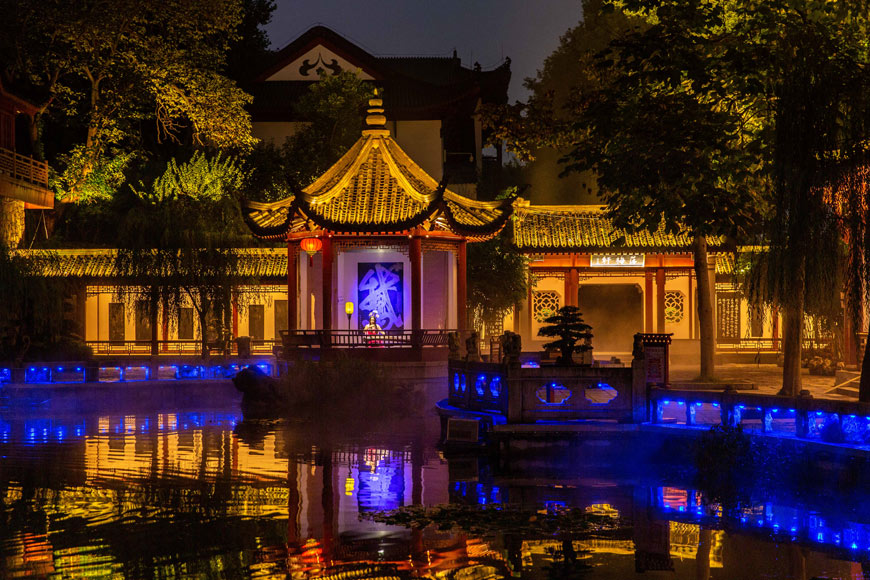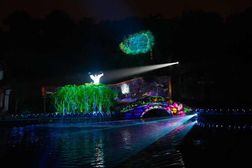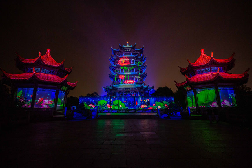 淡藍(lán)的燈光打在鵝池水面上,道士畫在墻上的黃鶴漸漸舞動起來,引出由真人演藝的黃鶴仙子。近到池邊的彎彎小橋,遠(yuǎn)到蛇山半腰處,通通都增添了不同顏色不同圖案的燈光設(shè)計。