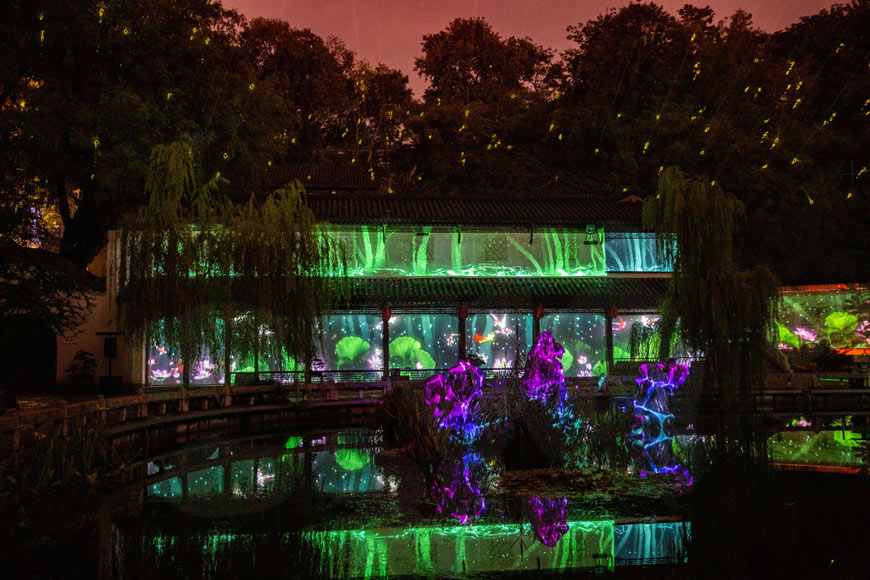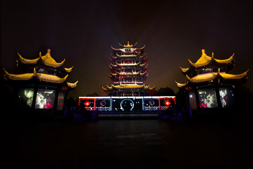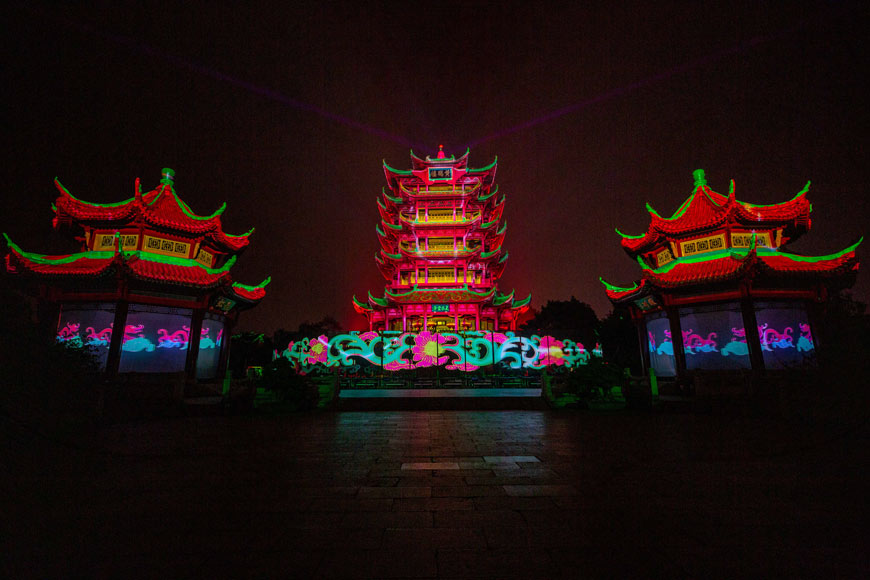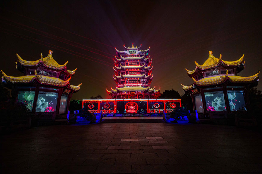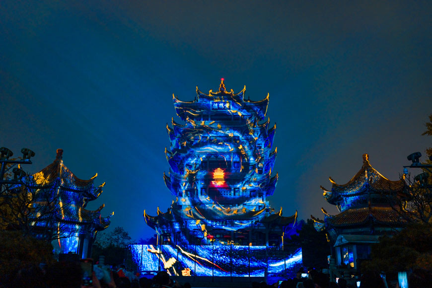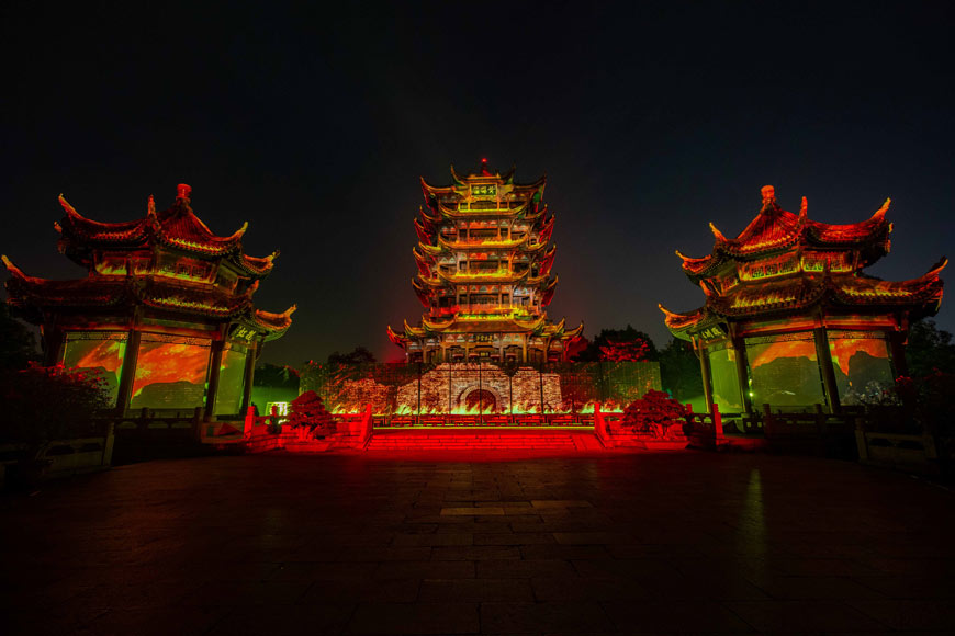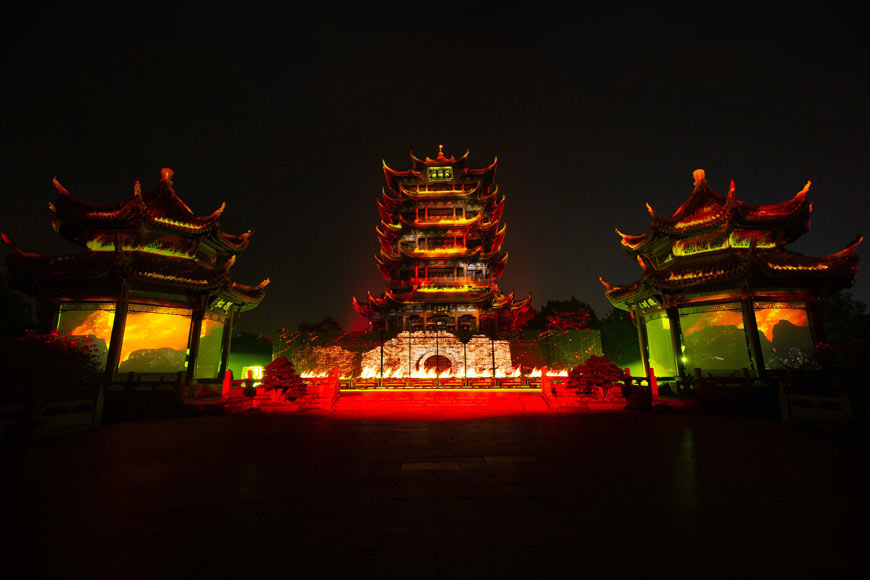 《仙鶴緣起》:通過動畫、音樂、投影、激光、霧森等手段,將夜間黃鶴樓公園的山體、池水、樓閣、亭臺、長廊活化。同時,融入真人實景演藝,再現(xiàn)蛇山上辛氏酒樓的喧鬧,講述一個道士報恩,畫鶴起舞的故事。