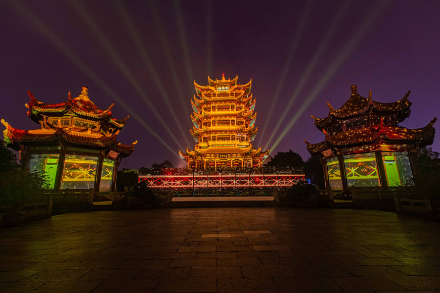 本項目是以武漢文化地標(biāo)—黃鶴樓為主體,以夜游黃鶴樓、俯瞰兩江四岸夜景為核心吸引力,借黃鶴樓講黃鶴樓的故事。以黃鶴樓公園為載體,以“科技和文化”融合為手段,圍繞其特有的歷史文化,采用現(xiàn)代數(shù)字光影技術(shù),以“聲、光、電”結(jié)合的手法,融入藝術(shù)表演的方式,通過高科技光影技術(shù)打造的城市地標(biāo)夜游新體驗。