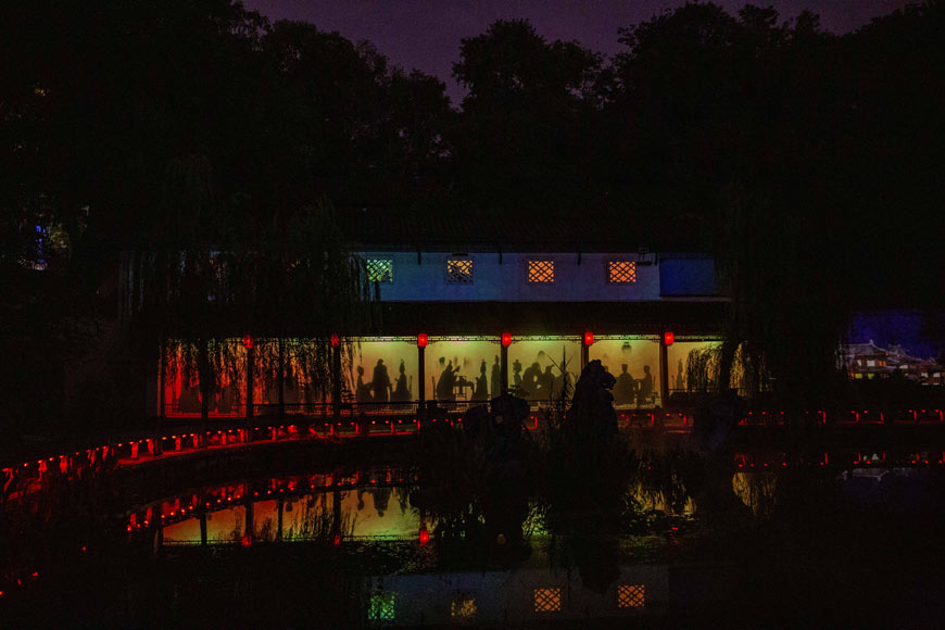 項目選取園區(qū)內(nèi)經(jīng)典景點,一場夜游,串起八個景點,一條動線鏈接《仙鶴緣起》和《鶴舞千秋》兩段演藝。