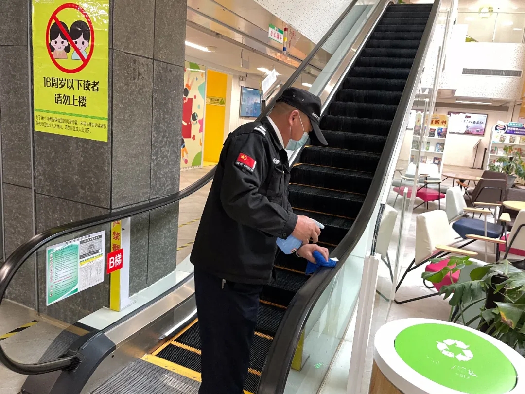 (六)物業(yè)公司每日對(duì)全館公共區(qū)域進(jìn)行2次消殺工作,尤其是垂直電梯轎廂、衛(wèi)生間、低幼、少兒閱覽區(qū)等密閉空間及自動(dòng)扶梯扶手等部位;每周對(duì)已關(guān)閉的3個(gè)報(bào)告廳的地面、座椅進(jìn)行1次消毒,工作人員如實(shí)填寫(xiě)《保潔及消毒記錄表》并張貼,由綜合管理部和當(dāng)值人員對(duì)清潔情況和《保潔及消毒記錄表》進(jìn)行檢查。
