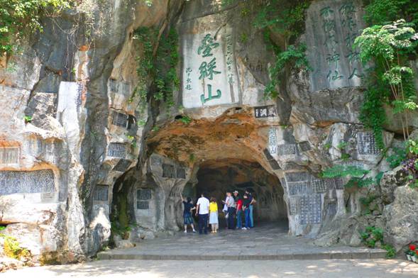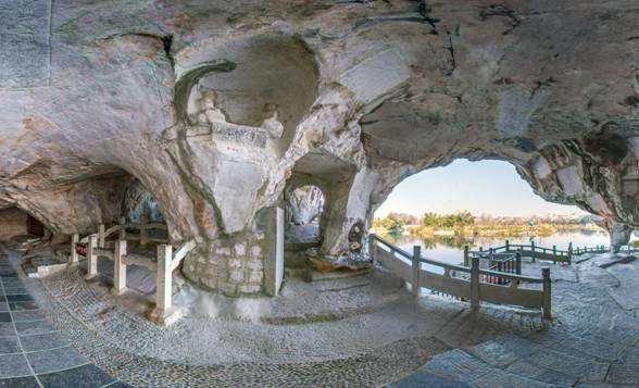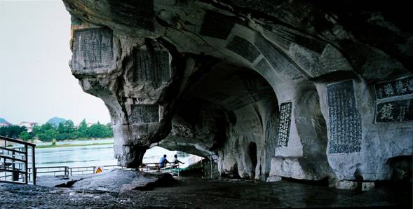伏波山現(xiàn)存摩崖石刻112件,其中藝術(shù)價(jià)值最高的是宋代大書(shū)畫(huà)家米芾的自畫(huà)像和親筆題名;疊彩山半山風(fēng)洞處精美石刻隨處可見(jiàn),風(fēng)洞右上方陳毅元帥“愿作桂林人,不愿作神仙”石刻。