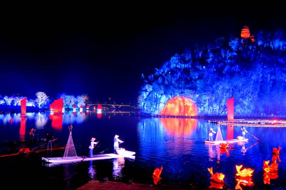景區(qū)還有特色的文藝演出節(jié)目,其中有依托桂林古代戰(zhàn)時(shí)烽火城墻遺址,融合了地方非遺文化——?jiǎng)⑷愫桶⑴8鐐髌鎼?ài)情故事的木龍湖光影秀、有傳承千年的漓江漁民傳統(tǒng)原生態(tài)魚(yú)鷹捕魚(yú)表演、有展現(xiàn)瑤族文化的荷塘梳妝等。另外,桂湖漁火秀是目前桂林市陣容最宏大、場(chǎng)面最壯觀、表演技法最傳統(tǒng)的原生態(tài)魚(yú)鷹捕魚(yú)表演秀。