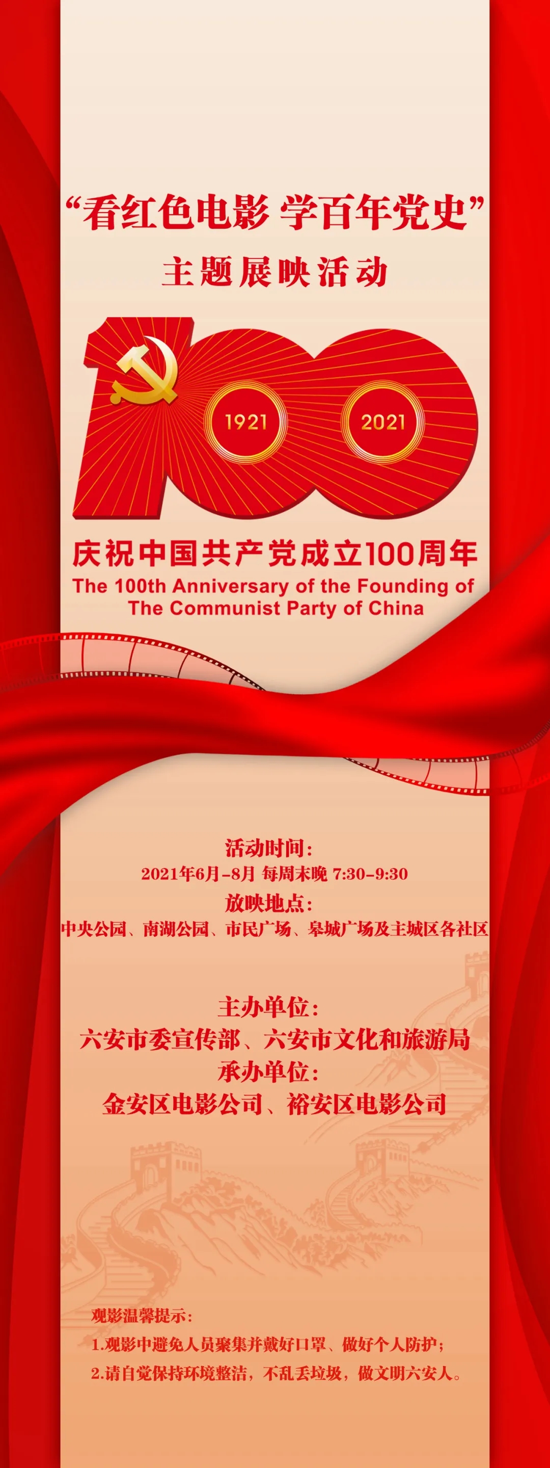 為慶祝中國共產(chǎn)黨成立100周年,展示中國共產(chǎn)黨百年光輝歷程和偉大功績,豐富城區(qū)居民精神文化生活,中共六安市委宣傳部、六安市文化和旅游局組織“看紅色電影學百年黨史”主題展映活動。通過系列紅色影片,用鏡頭帶大家走進那一段崢嶸歲月,共同學習黨的百年光輝歷史。