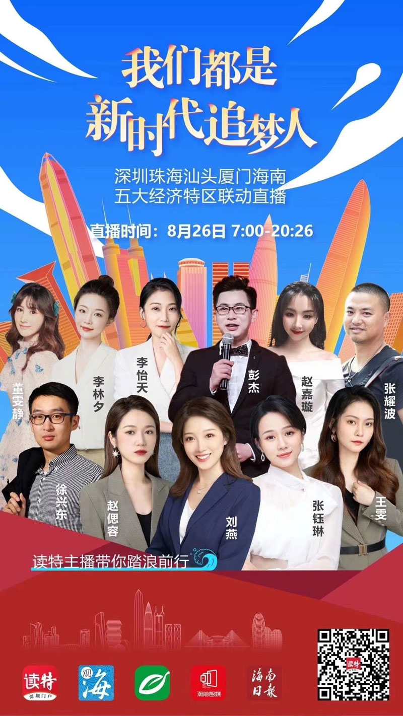 2020年8月26日,在深圳經(jīng)濟(jì)特區(qū)建立40周年之際,聯(lián)動(dòng)珠海、廈門、汕頭、海南五大經(jīng)濟(jì)特區(qū)主流新媒體平臺(tái)推出大型直播活動(dòng)《我們都是新時(shí)代追夢(mèng)人》,展現(xiàn)五個(gè)經(jīng)濟(jì)特區(qū)改革開放幾十年間的發(fā)展變化。這也是五大經(jīng)濟(jì)特區(qū)首次聯(lián)動(dòng)直播。讀特客戶端這一創(chuàng)意實(shí)現(xiàn)了新媒體傳播的一次新跨越。
