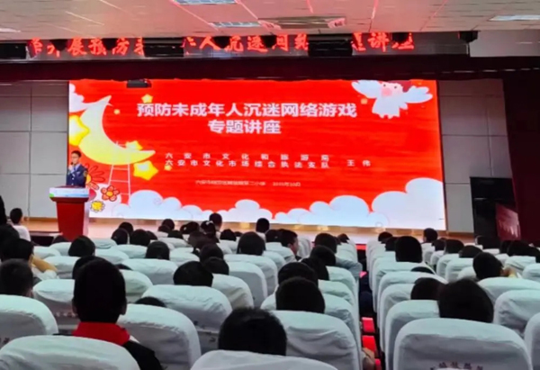 本次專題講座近300名同學(xué)參加,發(fā)放印有預(yù)防沉迷網(wǎng)絡(luò)游戲宣傳標(biāo)語的文具袋、水杯、雨傘等宣傳品近400件。(六安市文化和旅游局供稿)