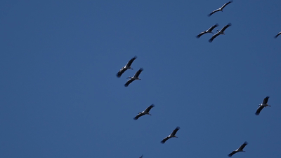 這群大鳥通體雪白,只有在翅膀邊緣和下側(cè)是黑色,它們有著長長的嘴巴,外形像極了傳說中的“仙鶴”。深秋湛藍的天空下,大鳥變換著各種隊形凌空翱翔,就像士兵接受檢閱一樣,這群大鳥就是有著“鳥類大熊貓”之稱,被國際自然保護聯(lián)盟定為瀕危物種的東方白鸛。