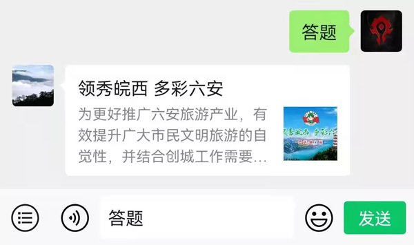 方法二:在公眾號(hào)“六安市文化和旅游局發(fā)布”對(duì)話框,輸入“答題”進(jìn)入活動(dòng)頁面;